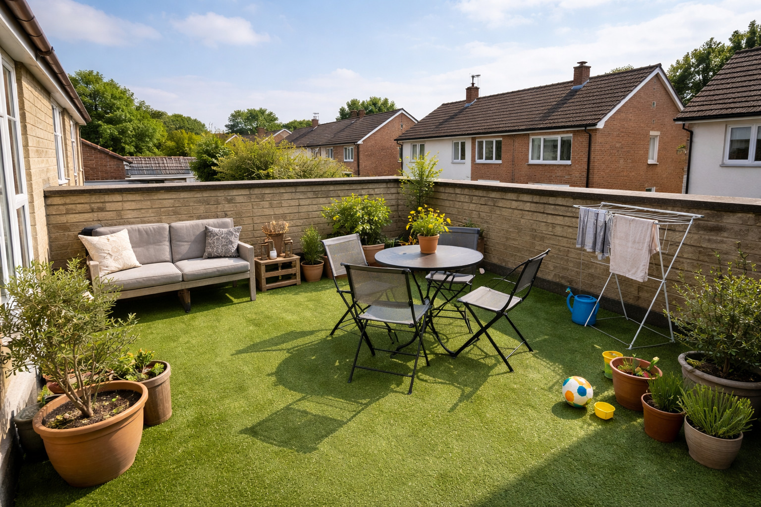 El césped artificial para terrazas en áticos te permite delimitar zonas con personalidad propia. Combínalo con tarimas de madera para crear contraste, instálalo alrededor de tu zona de piscina hinchable o jacuzzi, o úsalo para definir un área de juegos infantil segura y mullida. Las posibilidades de diseño son infinitas.